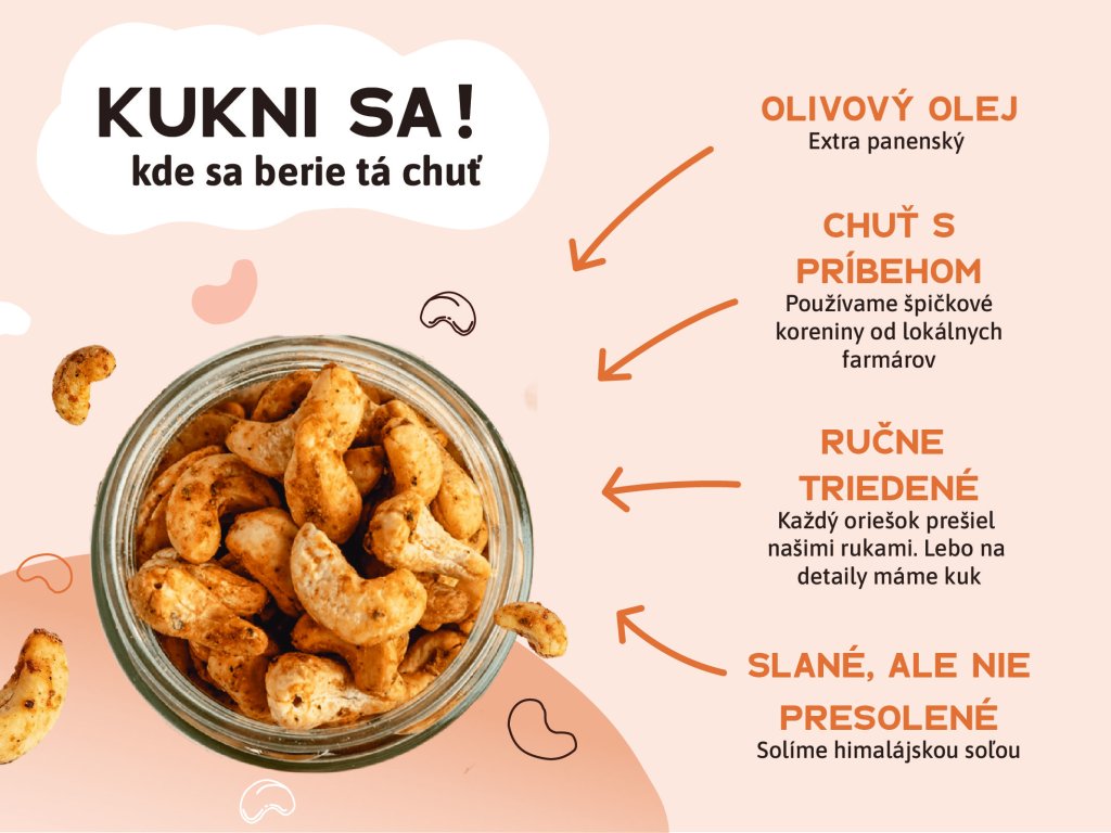 Ručne triedené kešu, pomaly pečené s údenou paprikou a štipkou údenej soli. Veľmi jemne pikantné s himalájskou soľou. Voňavé a tak chrumkavé, že zmiznú skôr, než ich stihneš ponúknuť.