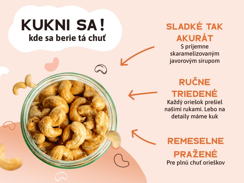 Každé kešu nás prejde pomalým, poctivým pražením, aby mala dokonalú chuť, vôňu a chrumkavosť. Používame len kvalitné suroviny a žiadne zbytočnosti navyše.