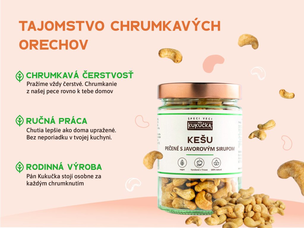 Ručne triedené kešu, pomaly pečené s javorovým sirupom. Jemne sladké, karamelové a tak nebezpečne dobré, že by si ich mal schovať aj pred sebou.
