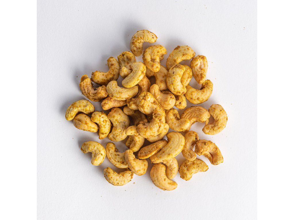 Ručne triedené kešu, pomaly pečené s kari korením a štipkou himalájskej soli. Slaný snack s exotickým závanom – zohreje, ale nepáli.