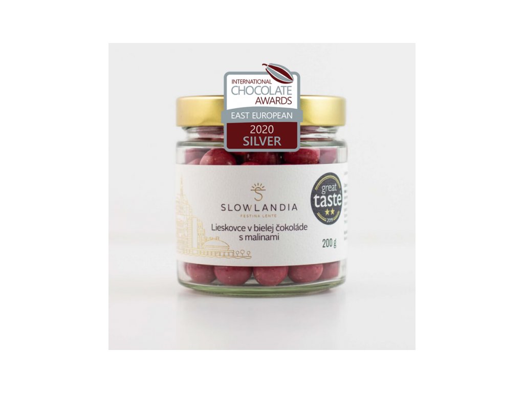 majstrovsky obalené v bielej čokoláde s lyofilizovanými malinami