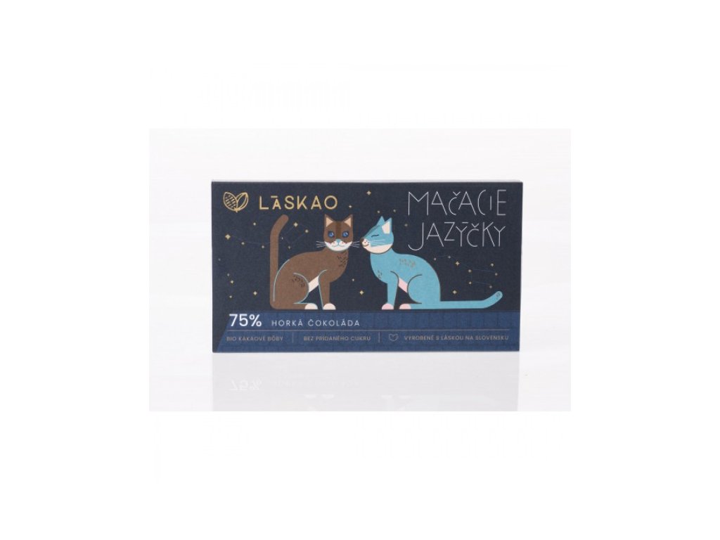 Mačacie jazýčky z horkej čokolády vyrobenej z BIO kakaových bôbov pôvodom z Peru v kvalite Fino de aroma, sladené jakonom a xylitolom, čo sú prírodné sladidlá, ktoré majú počet kalórií nižší o 40 % ako biely cukor, rovnako majú nízky glykemický index (GI1, GI7) a zabraňujú tvorbe zubného kazu.
