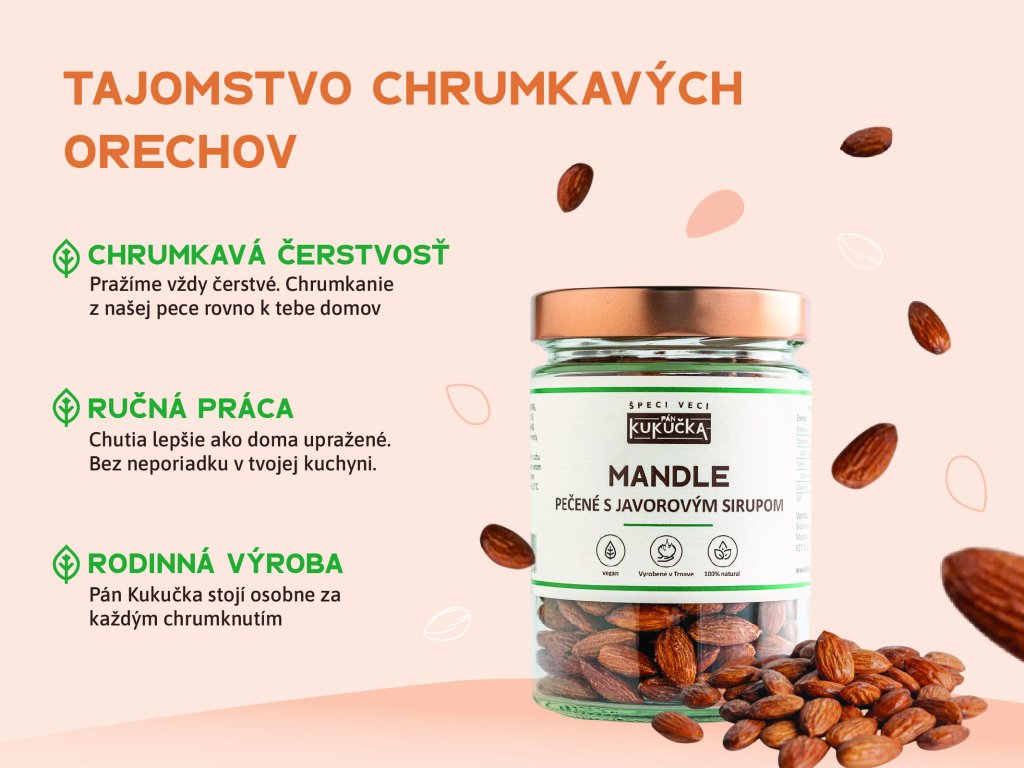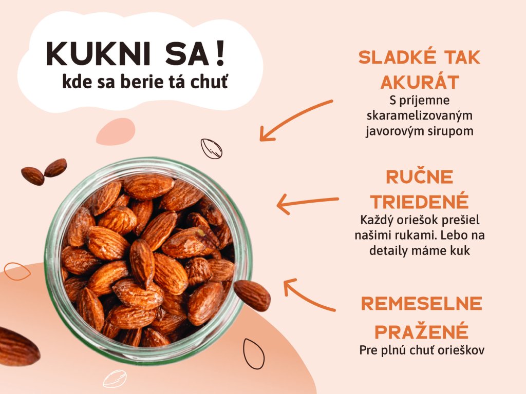 Každá mandla u nás prejde pomalým, poctivým pražením, aby mala dokonalú chuť, vôňu a chrumkavosť. Používame len kvalitné suroviny a žiadne zbytočnosti navyše.