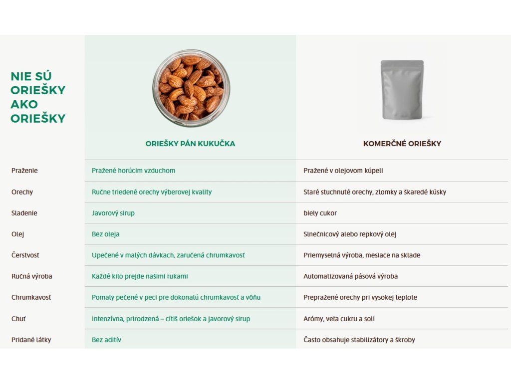 Žiadne triky, len kvalitné oriešky, trocha sirupu a poctivé spracovanie. A samozrejme, kvalitné mandle.
