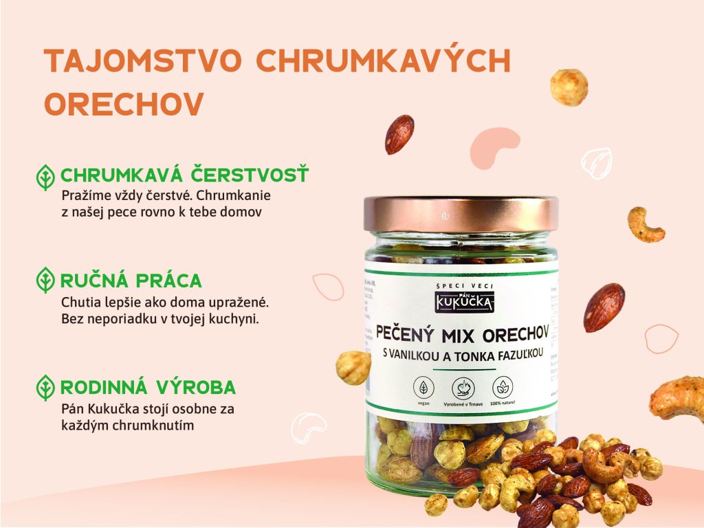 Každý oriešok u nás prejde pomalým, poctivým pražením, aby mal dokonalú chuť, vôňu a chrumkavosť. Používame len kvalitné suroviny a žiadne zbytočnosti navyše.