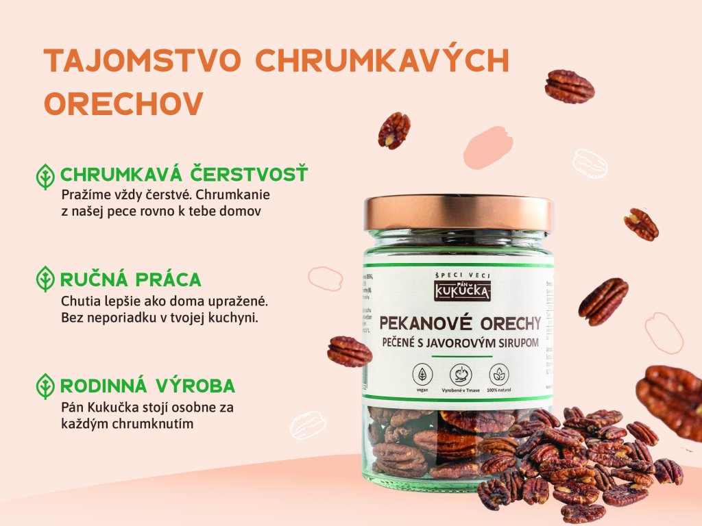 Každý pekanový orech u nás prejde pomalým, poctivým pražením, aby mal dokonalú chuť, vôňu a chrumkavosť. Používame len kvalitné suroviny a žiadne zbytočnosti navyše.