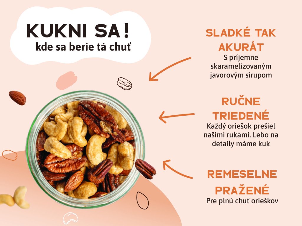 Sladíme javorovým sirupom, nie cukrom. Vďaka nemu majú oriešky jemne skaramelizovanú chuť a prirodzenú chrumkavosť.