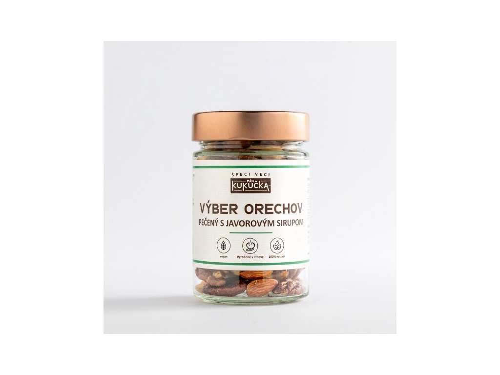 Ručne triedený mix orechov, pomaly pečený s javorovým sirupom. Sladká harmónia chutí, ktorá spája chrumkavosť mandlí, kešu a pekanov do jednej misky.