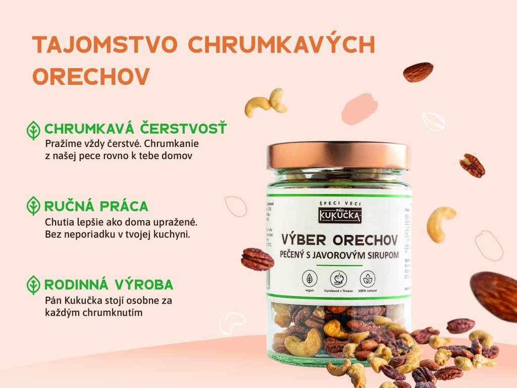 Každý oriešok u nás prejde pomalým, poctivým pražením, aby mal dokonalú chuť, vôňu a chrumkavosť. Používame len kvalitné suroviny a žiadne zbytočnosti navyše.